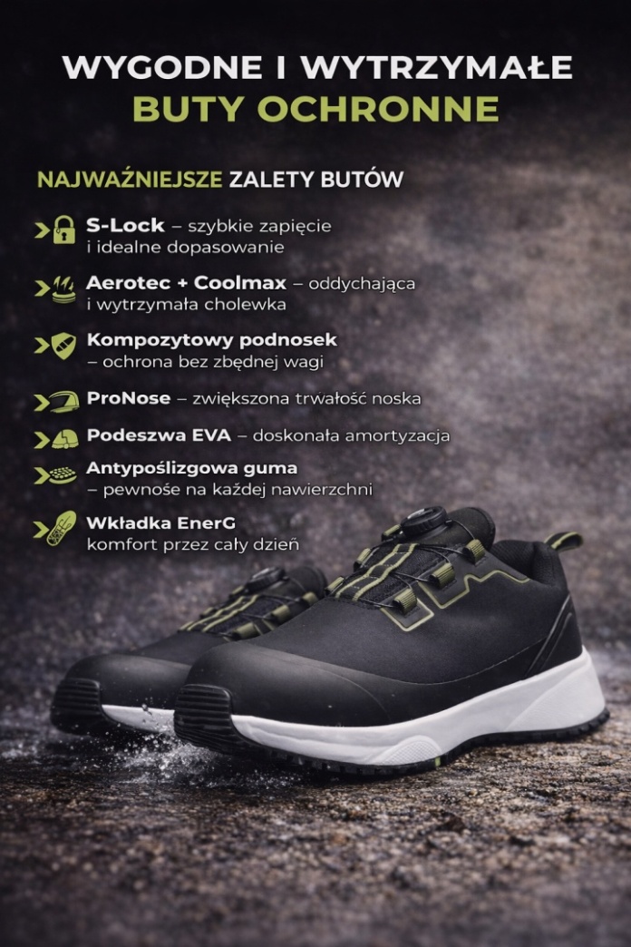 Lekkie buty ochronne ESD o sportowym kroju z systemem zapinania S-lock.